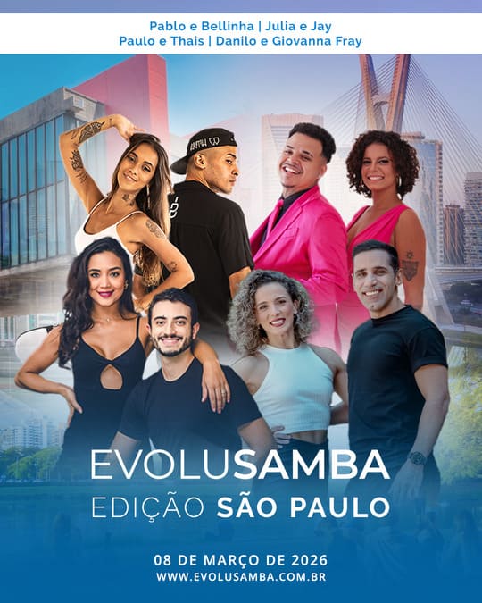 O EvoluSamba chega a São Paulo com uma experiência pensada especialmente para iniciantes que desejam aprender do zero, ganhar segurança, dominar fundamentos e aproveitar cada momento com qualidade. São 4 aulas exclusivas de gafieira, ministradas por professores renomados do RJ e de SP, criada para celebrar, fortalecer e inspirar ainda mais a cena da dança.